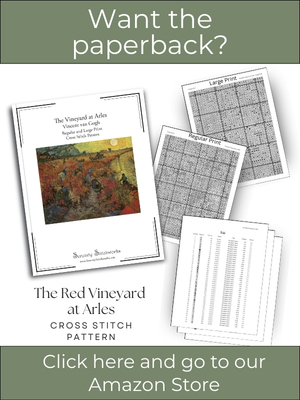 Celebrate the vivid warmth of van Gogh’s The Red Vineyard at Arles—the only painting he is known to have sold during his lifetime. This full-coverage cross stitch pattern captures the brilliance of autumn light as vineyard workers move through rows of red and gold under a glowing sky.